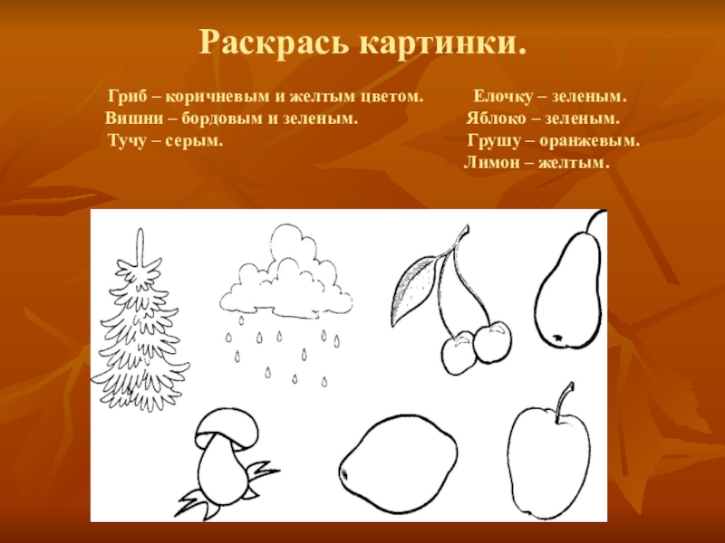 Вишни – бордовым и зеленым. Яблоко – зеленым.