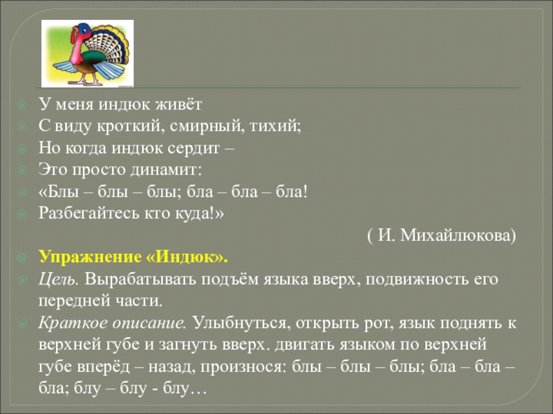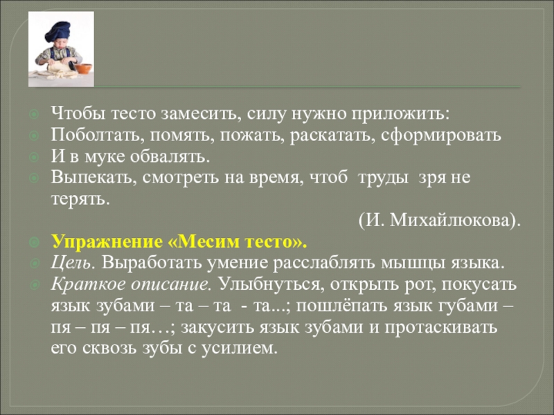 Краткое описание. Улыбнуться, открыть рот, покусать язык зубами – та – та - та...; пошлёпать язык губами – пя – пя – пя…; закусить язык зубами и протаскивать его сквозь зубы с усилием.