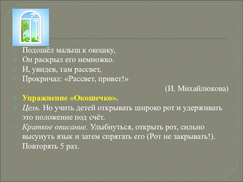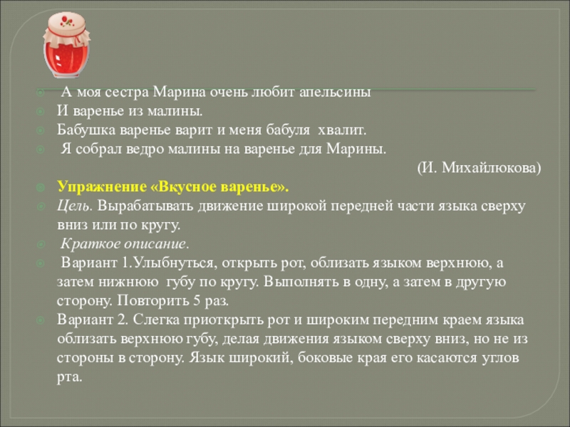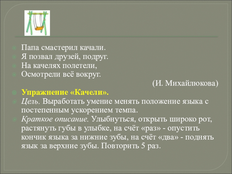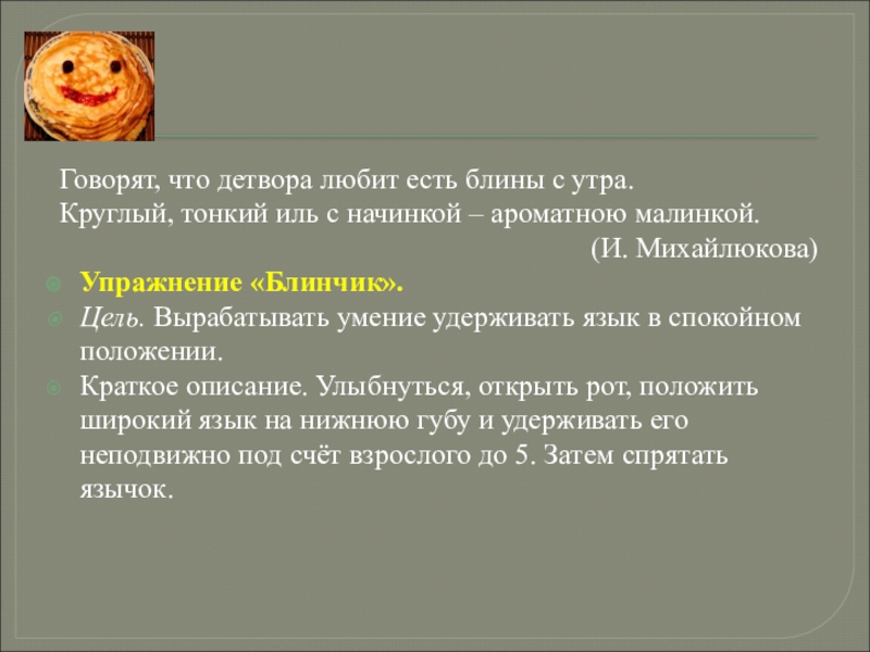Цель. Вырабатывать умение удерживать язык в спокойном положении.