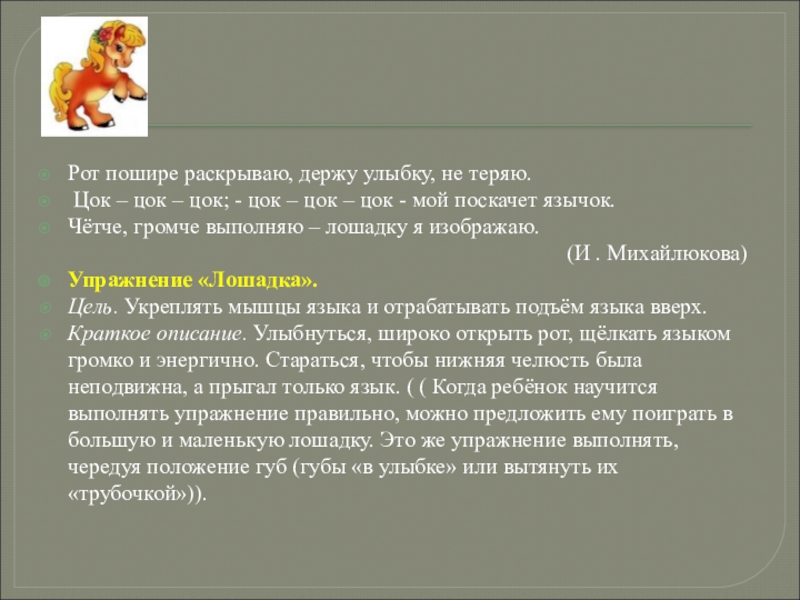 Краткое описание. Улыбнуться, широко открыть рот, щёлкать языком громко и энергично. Стараться, чтобы нижняя челюсть была неподвижна, а прыгал только язык. ( ( Когда ребёнок научится выполнять упражнение правильно, можно предложить ему поиграть в большую и маленькую лошадку. Это же упражнение выполнять, чередуя положение губ (губы «в улыбке» или вытянуть их «трубочкой»)).
