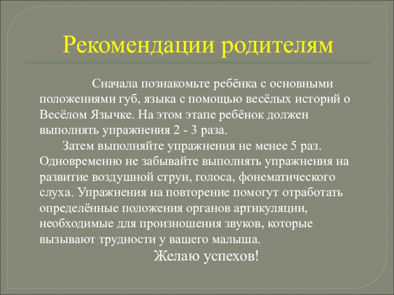 Затем выполняйте упражнения не менее 5 раз. Одновременно не забывайте выполнять упражнения на развитие воздушной струи, голоса, фонематического слуха. Упражнения на повторение помогут отработать определённые положения органов артикуляции, необходимые для произношения звуков, которые вызывают трудности у вашего малыша.