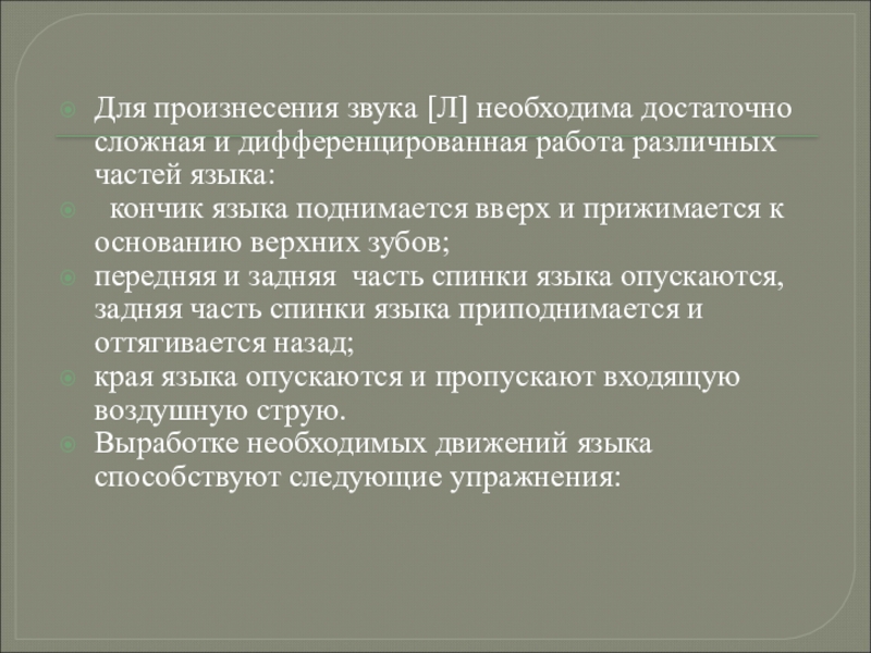 Слайд 3Для произнесения звука [Л] необходима достаточно сложная и дифференцированная работа различных