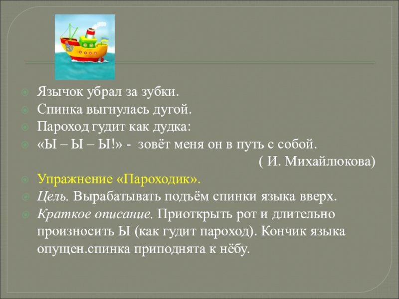 Краткое описание. Приоткрыть рот и длительно произносить Ы (как гудит пароход). Кончик языка опущен.спинка приподнята к нёбу.