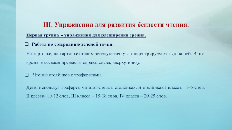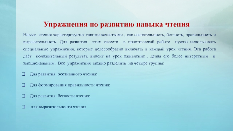 сознательность, беглость, правильность и выразительность. Для развития этих качеств в практической работе нужно использовать специальные упражнения, которые целесообразно включать в каждый урок чтения. Эта работа даёт положительный результат, вносит на урок оживление , делая его более интересным и эмоциональным. Все упражнения можно разделить на четыре группы: