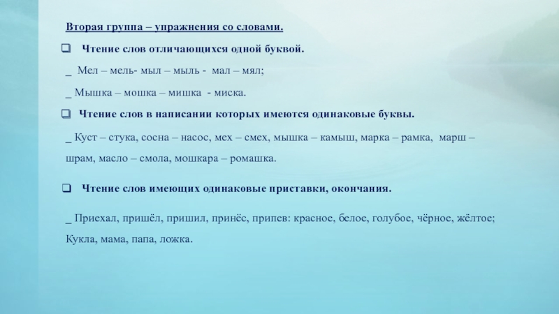 _ Приехал, пришёл, пришил, принёс, припев: красное, белое, голубое, чёрное, жёлтое; Кукла, мама, папа, ложка.
