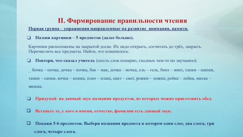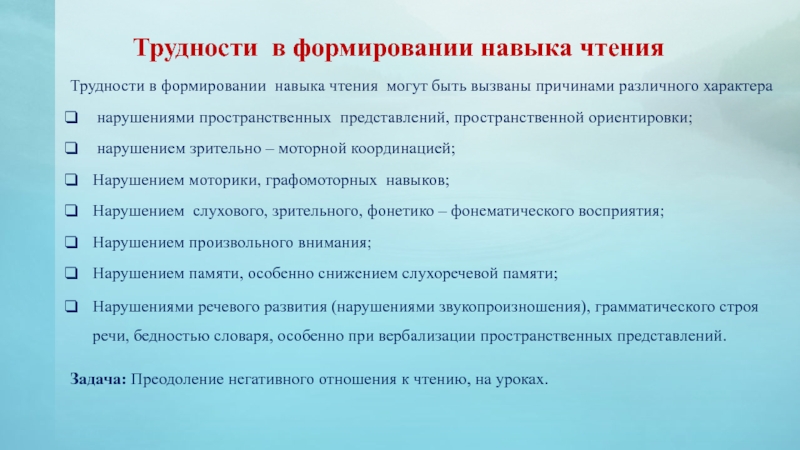 Нарушением слухового, зрительного, фонетико – фонематического восприятия;