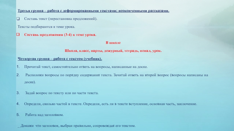 Слайд 9Третья группа – работа с деформированными текстами; неоконченными рассказами.