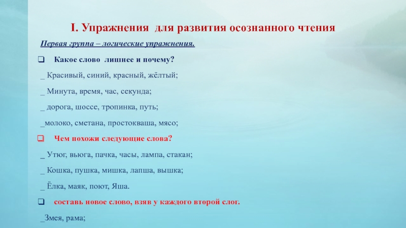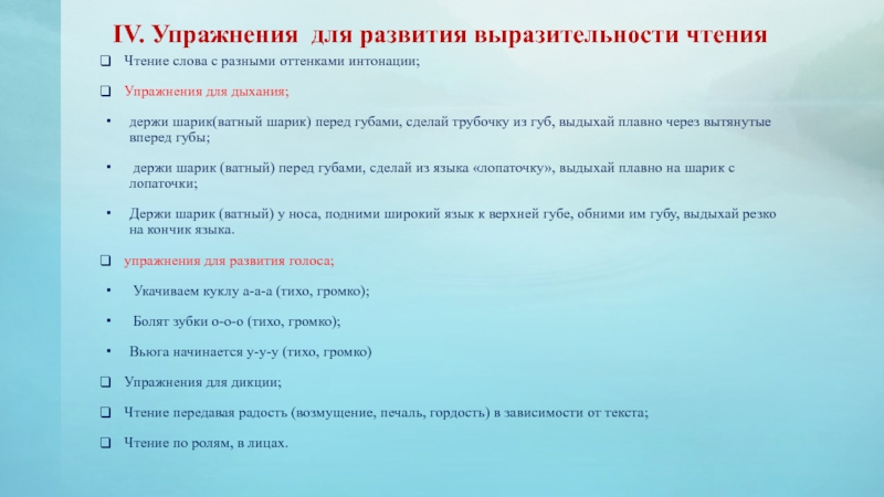 Слайд 15IV. Упражнения для развития выразительности чтения