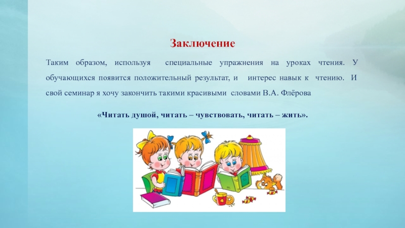появится положительный результат, и интерес навык к чтению. И свой семинар я хочу закончить такими красивыми словами В.А. Флёрова