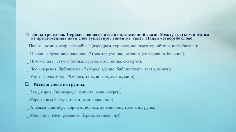 Слайд 7 Даны три слова. Первые два находятся а определенной связи. Между