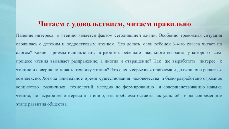 сегодняшней жизни. Особенно тревожная ситуация сложилась с детским и подростковым чтением. Что делать, если ребенок 3-4-го класса читает по слогам? Какие приёмы использовать в работе с ребенком школьного возраста, у которого сам процесс чтения вызывает раздражение, а иногда и отвращение? Как же выработать интерес к чтению и совершенствовать технику чтения? Это очень серьезная проблема и должна она решаться комплексно. Хотя за длительное время существования человечества и было разработано огромное количество различных технологий, методик по формированию и совершенствованию навыка чтения, по выработке интереса к чтению, эта проблема остается актуальной и на современном этапе развития общества.