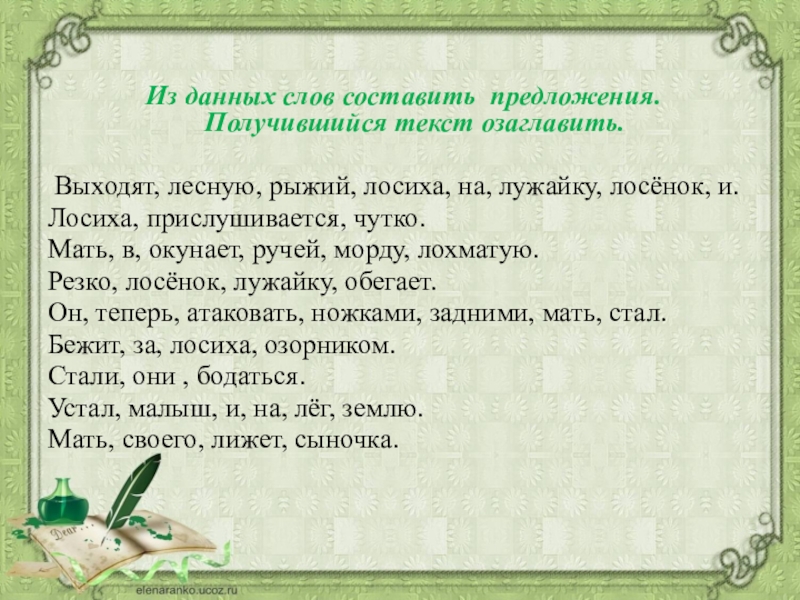 Слайд 7 Из данных слов составить предложения. Получившийся текст озаглавить.