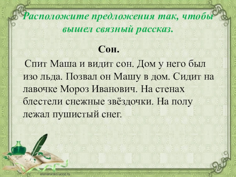 Спит Маша и видит сон. Дом у него был изо льда. Позвал он Машу в дом. Сидит на лавочке Мороз Иванович. На стенах блестели снежные звёздочки. На полу лежал пушистый снег.