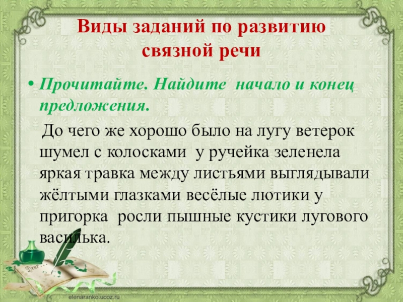 До чего же хорошо было на лугу ветерок шумел с колосками у ручейка зеленела яркая травка между листьями выглядывали жёлтыми глазками весёлые лютики у пригорка росли пышные кустики лугового василька.