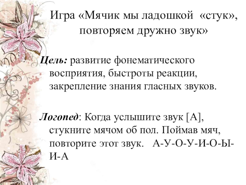 Игра «Мячик мы ладошкой «стук», повторяем дружно звук»Цель: развитие фонематического восприятия, быстроты реакции, закрепление знания гласных звуков.Логопед: Когда услышите звук [А], стукните мячом об пол. Поймав мяч, повторите этот звук. А-У-О-У-И-О-Ы-И-А