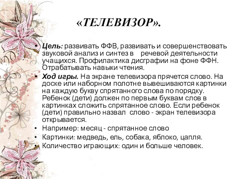 «ТЕЛЕВИЗОР».Цель: развивать ФФВ, развивать и совершенствовать звуковой анализ и синтез в  речевой деятельности учащихся. Профилактика дисграфии