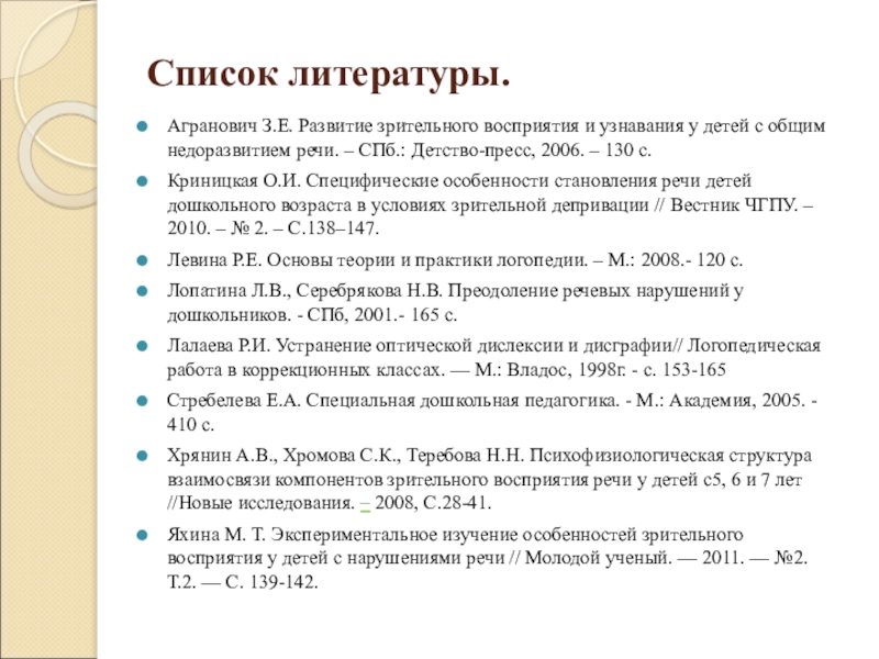 Левина Р.Е. Основы теории и практики логопедии. – М.: 2008.- 120 с.
