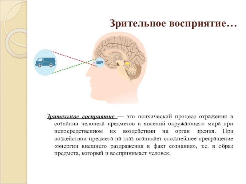 Зрительное восприятие — это психический процесс отражения в сознании человека предметов и явлений окружающего мира при непосредственном их воздействии на орган зрения. При воздействии предмета на глаз возникает сложнейшее превращение «энергии внешнего раздражения в факт сознания», т.е. в образ предмета, который и воспринимает человек.