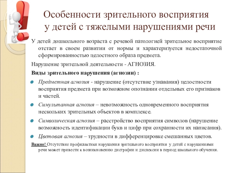 Важно! Отсутствие профилактики нарушения зрительного восприятия у детей с нарушениями речи может привести к возникновению дисграфии и дислексии в период школьного обучения.