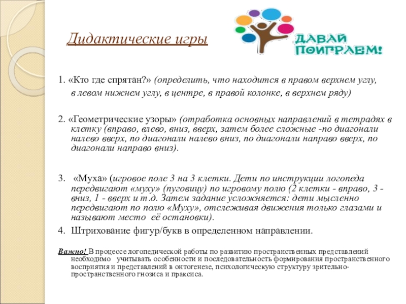 Важно! В процессе логопедической работы по развитию пространственных представлений необходимо учитывать особенности и последовательность формирования пространственного восприятия и представлений в онтогенезе, психологическую структуру зрительно- пространственного гнозиса и праксиса.
