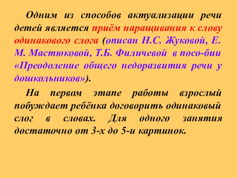 Одним из способов актуализации речи детей является приём наращивания к слову одинакового слога (описан Н.С. Жуковой, Е.М. Мастюковой, Т.Б. Филичевой в посо-бии «Преодоление общего недоразвития речи у дошкольников»).На первом этапе работы взрослый побуждает ребёнка договорить одинаковый