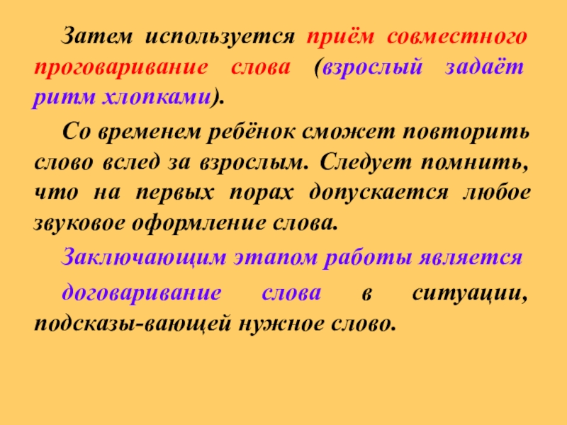 Затем используется приём совместного проговаривание слова (взрослый задаёт ритм хлопками).Со временем ребёнок сможет повторить слово вслед за