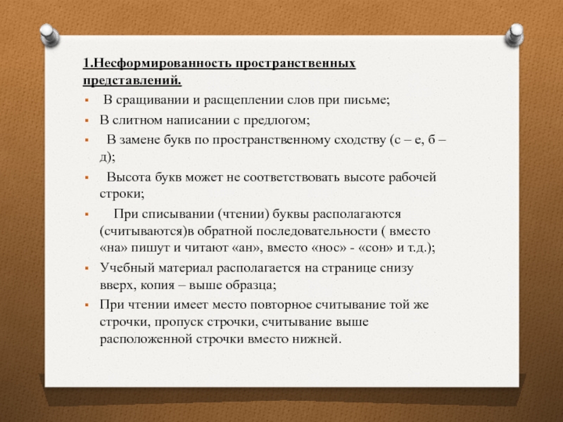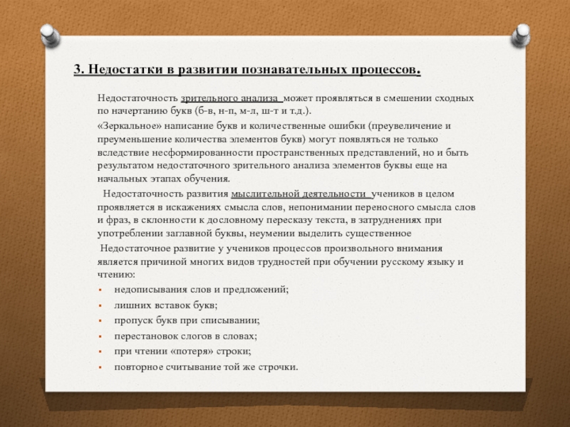 Недостаточность развития мыслительной деятельности учеников в целом проявляется в искажениях смысла слов, непонимании переносного смысла слов и фраз, в склонности к дословному пересказу текста, в затруднениях при употреблении заглавной буквы, неумении выделить существенное