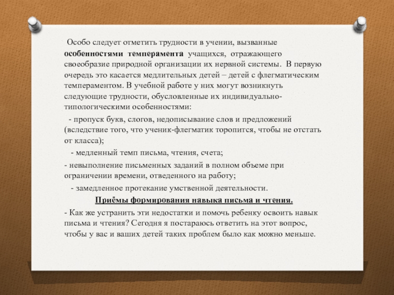 Слайд 11 Особо следует отметить трудности в учении, вызванные особенностями темперамента учащихся,