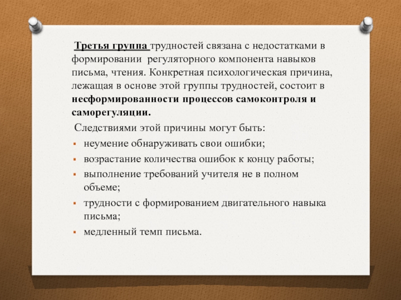 навыков письма, чтения. Конкретная психологическая причина, лежащая в основе этой группы трудностей, состоит в несформированности процессов самоконтроля и саморегуляции.