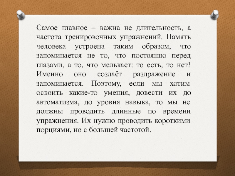 человека устроена таким образом, что запоминается не то, что постоянно перед глазами, а то, что мелькает: то есть, то нет! Именно оно создаёт раздражение и запоминается. Поэтому, если мы хотим освоить какие-то умения, довести их до автоматизма, до уровня навыка, то мы не должны проводить длинные по времени упражнения. Их нужно проводить короткими порциями, но с большей частотой.