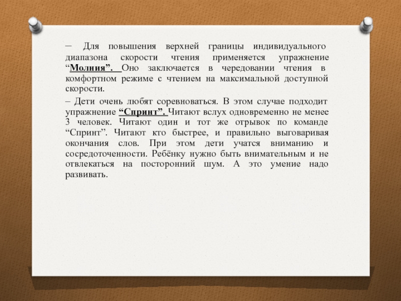 Слайд 24– Для повышения верхней границы индивидуального диапазона скорости чтения применяется упражнение