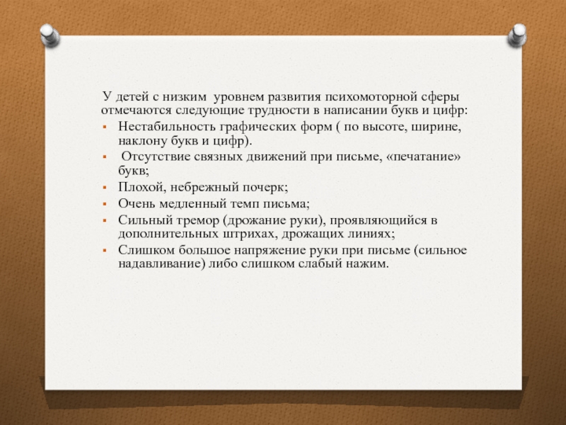 Слайд 5 У детей с низким уровнем развития психомоторной сферы отмечаются следующие