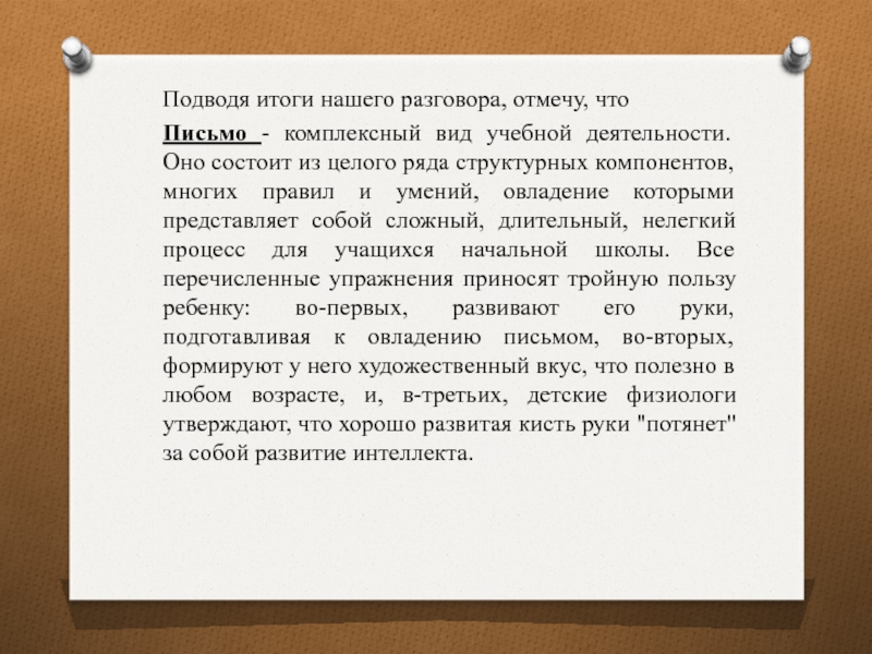 деятельности. Оно состоит из целого ряда структурных компонентов, многих правил и умений, овладение которыми представляет собой сложный, длительный, нелегкий процесс для учащихся начальной школы. Все перечисленные упражнения приносят тройную пользу ребенку: во-первых, развивают его руки, подготавливая к овладению письмом, во-вторых, формируют у него художественный вкус, что полезно в любом возрасте, и, в-третьих, детские физиологи утверждают, что хорошо развитая кисть руки "потянет" за собой развитие интеллекта.