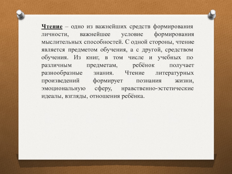 Слайд 19Чтение – одно из важнейших средств формирования личности, важнейшее условие формирования