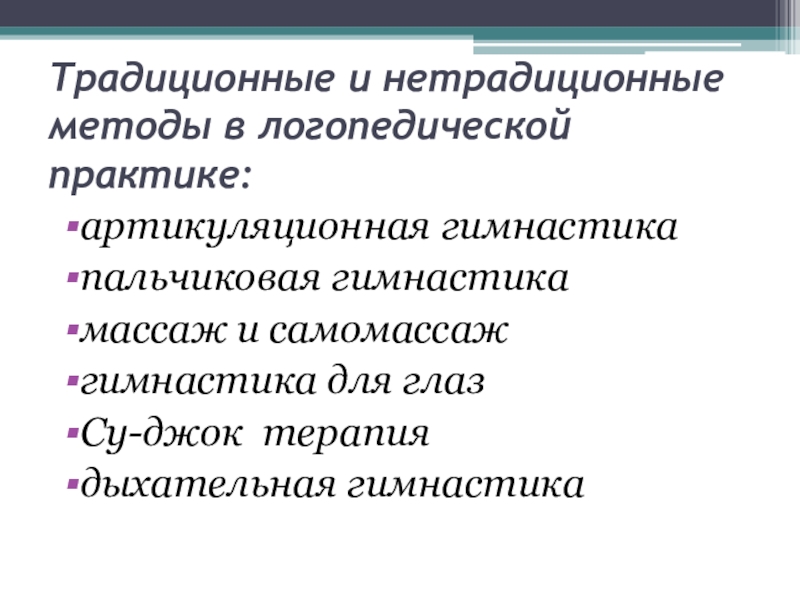Традиционные и нетрадиционные методы в логопедической практике:артикуляционная гимнастикапальчиковая гимнастикамассаж и самомассажгимнастика для глазСу-джок терапиядыхательная гимнастика
