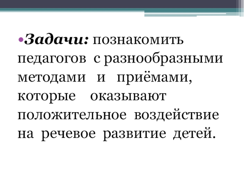 Задачи: познакомитьпедагогов с разнообразными методами и приёмами,которые оказываютположительное воздействиена речевое развитие детей.