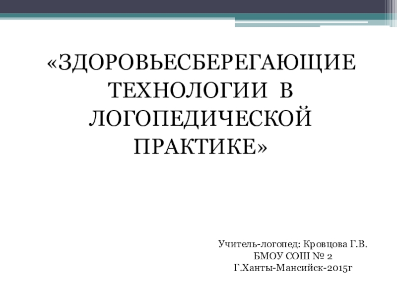 «ЗДОРОВЬЕСБЕРЕГАЮЩИЕ ТЕХНОЛОГИИ В ЛОГОПЕДИЧЕСКОЙ ПРАКТИКЕ»Учитель-логопед: Кровцова Г.В.БМОУ СОШ № 2Г.Ханты-Мансийск-2015г