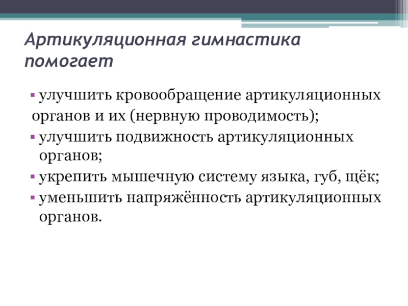 Артикуляционная гимнастика помогаетулучшить кровообращение артикуляционных органов и их (нервную проводимость);улучшить подвижность артикуляционных органов;укрепить мышечную систему языка, губ,