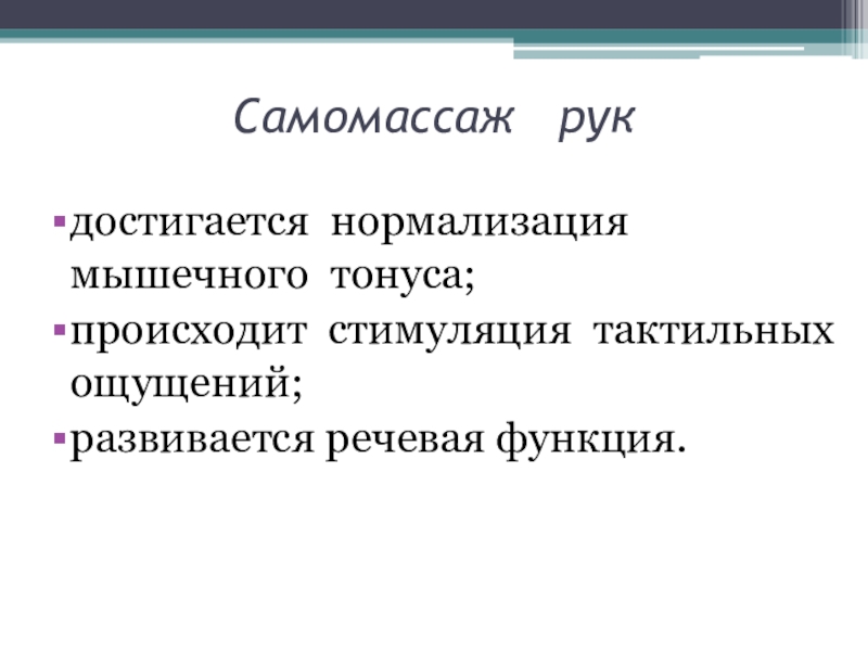 Самомассаж  рукдостигается нормализация мышечного тонуса;происходит стимуляция тактильных ощущений;развивается речевая функция.