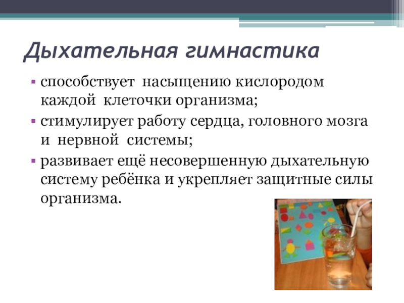 Дыхательная гимнастика способствует насыщению кислородом каждой клеточки организма;стимулирует работу сердца, головного мозга и нервной системы;развивает ещё несовершенную