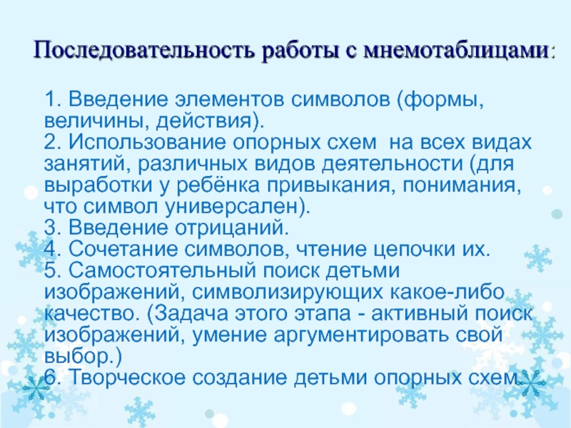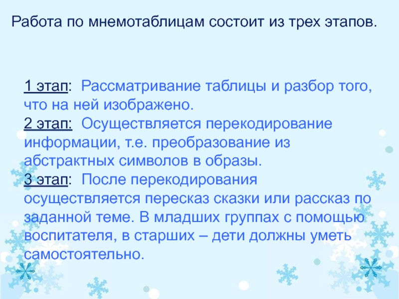 Слайд 10Работа по мнемотаблицам состоит из трех этапов.