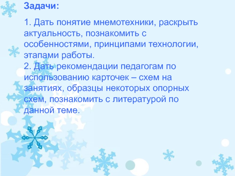 1. Дать понятие мнемотехники, раскрыть актуальность, познакомить с особенностями, принципами