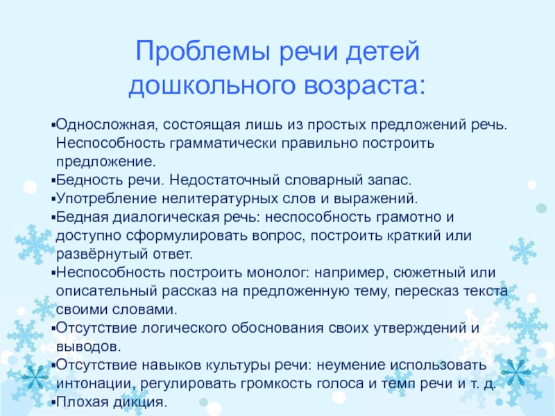Слайд 4Проблемы речи детей дошкольного возраста:
