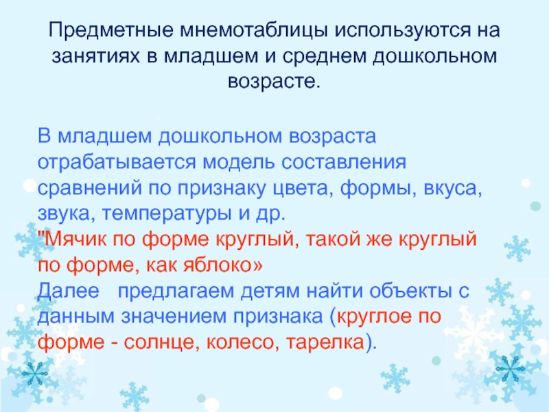 младшем дошкольном возраста отрабатывается модель составления сравнений по признаку цвета, формы, вкуса, звука, температуры и др.