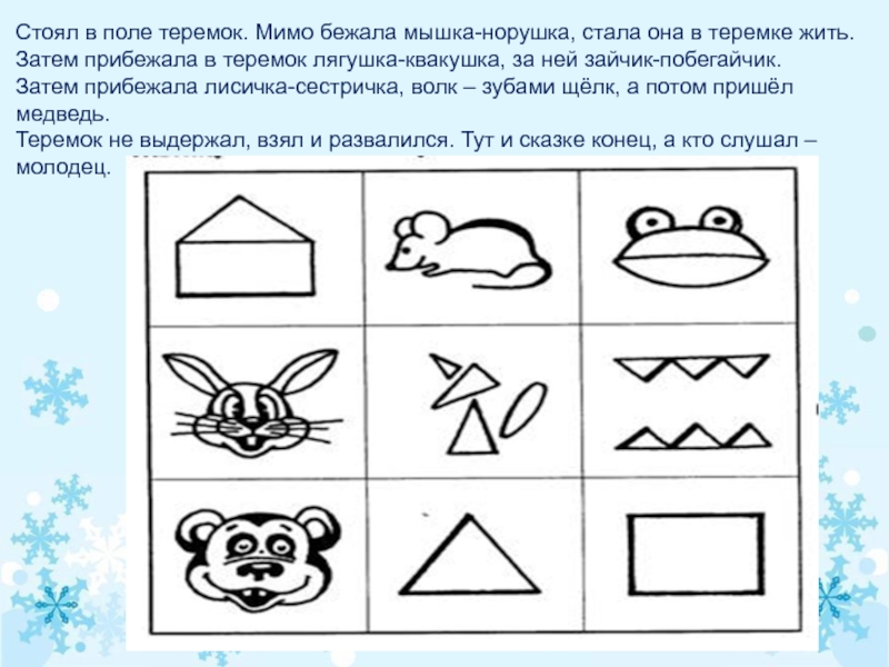 Слайд 9Стоял в поле теремок. Мимо бежала мышка-норушка, стала она в теремке