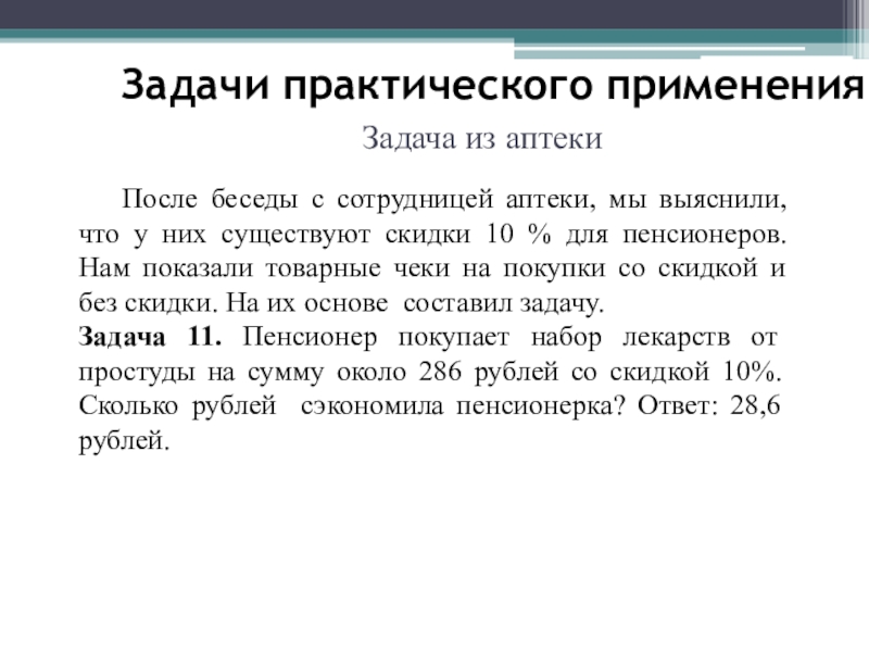 Задача 11. Пенсионер покупает набор лекарств от простуды на сумму около 286 рублей со скидкой 10%. Сколько рублей сэкономила пенсионерка? Ответ: 28,6 рублей.
