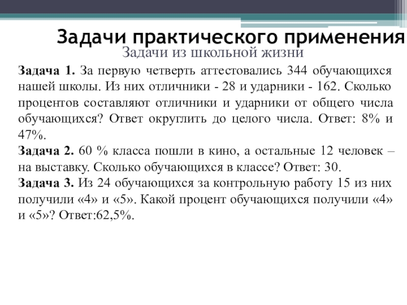 Задача 3. Из 24 обучающихся за контрольную работу 15 из них получили «4» и «5». Какой процент обучающихся получили «4» и «5»? Ответ:62,5%.