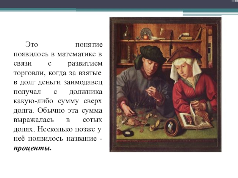 за взятые в долг деньги заимодавец получал с должника какую-либо сумму сверх долга. Обычно эта сумма выражалась в сотых долях. Несколько позже у неё появилось название - проценты.