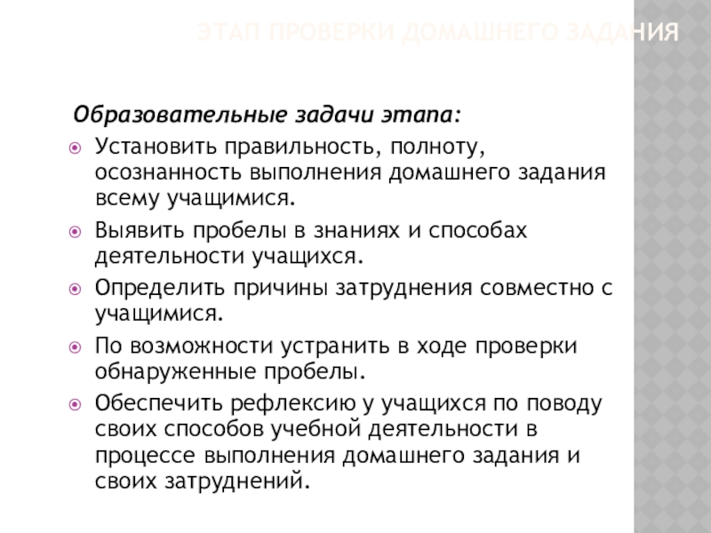 Обеспечить рефлексию у учащихся по поводу своих способов учебной деятельности в процессе выполнения домашнего задания и своих затруднений.