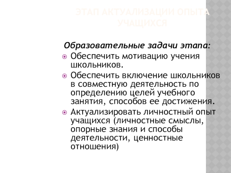 Слайд 16ЭТАП АКТУАЛИЗАЦИИ ОПЫТА УЧАЩИХСЯ